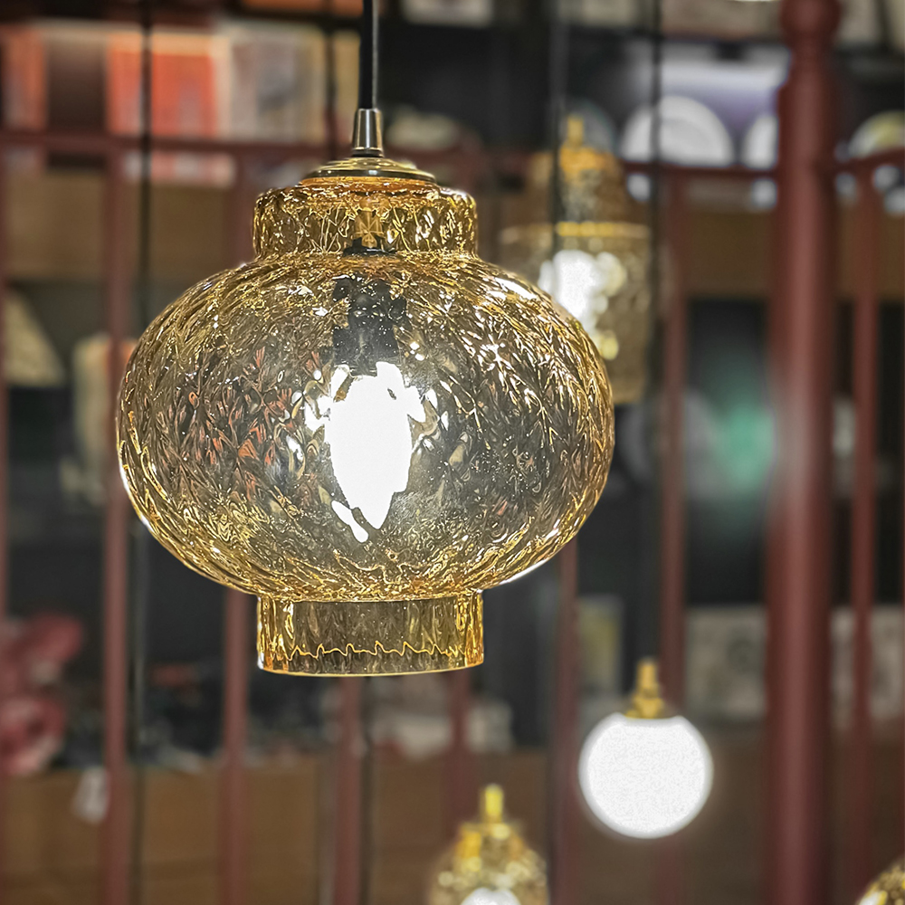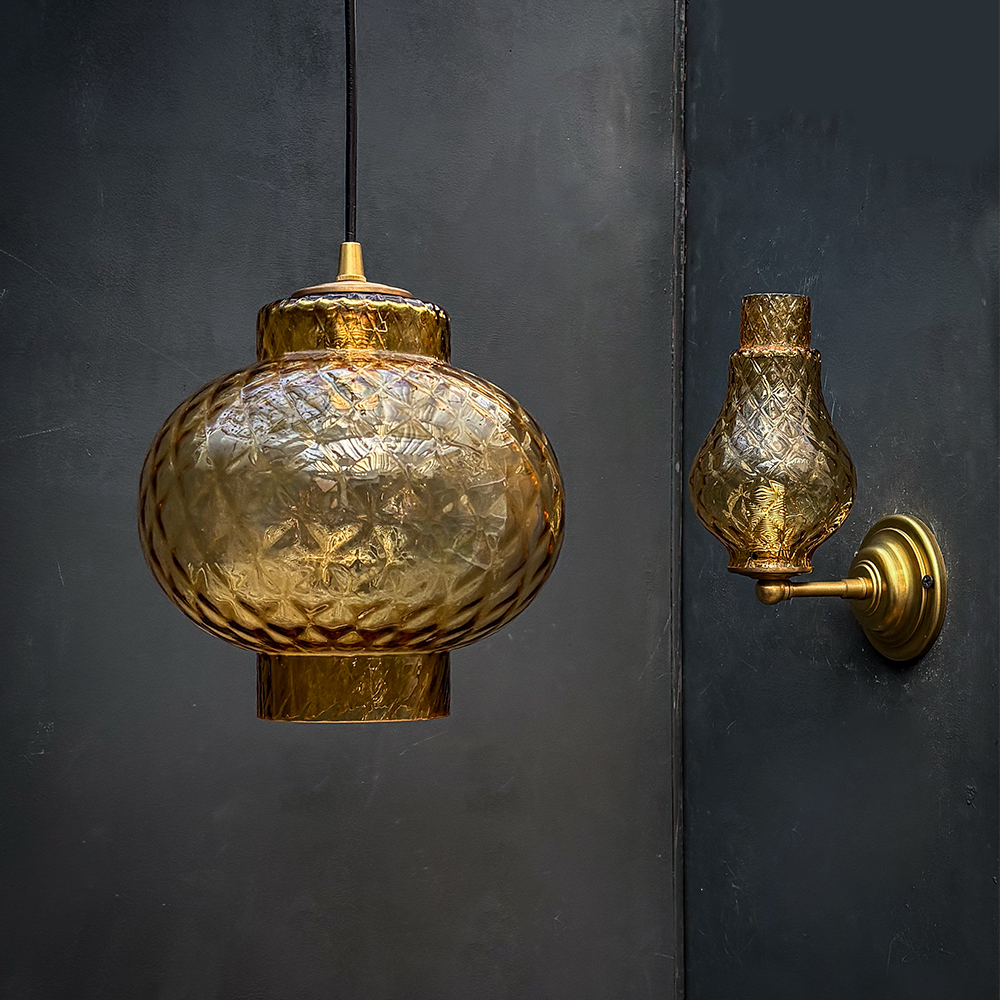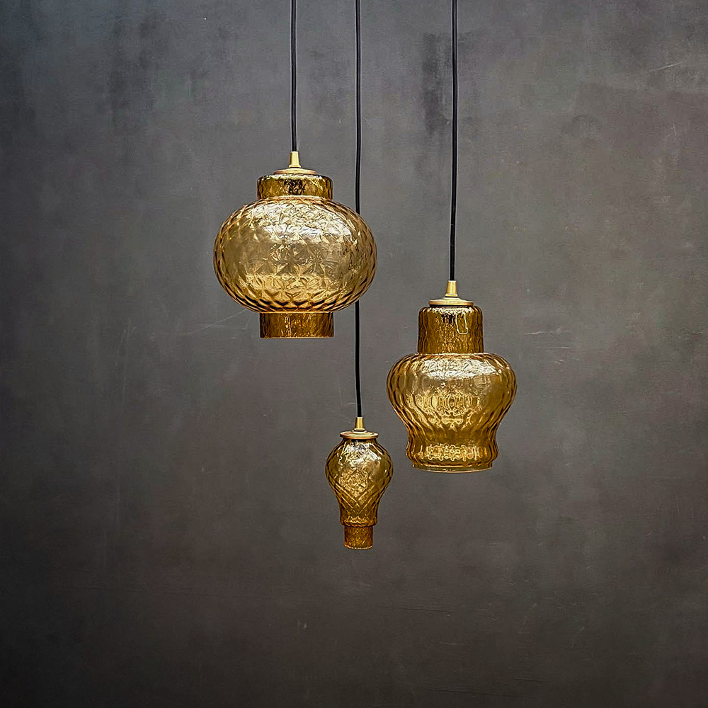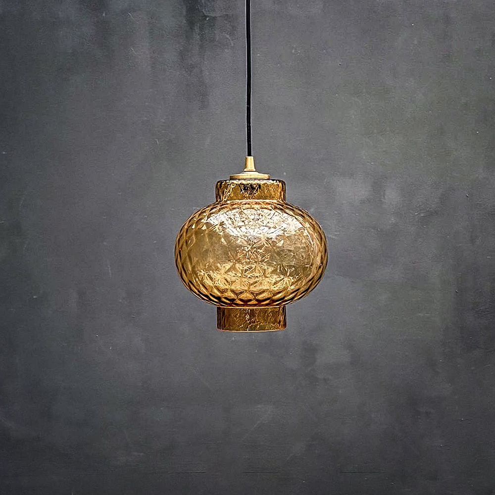 Suspension constituée d’une forme ronde en verre translucide ambrée avec une texture alvéolée.
