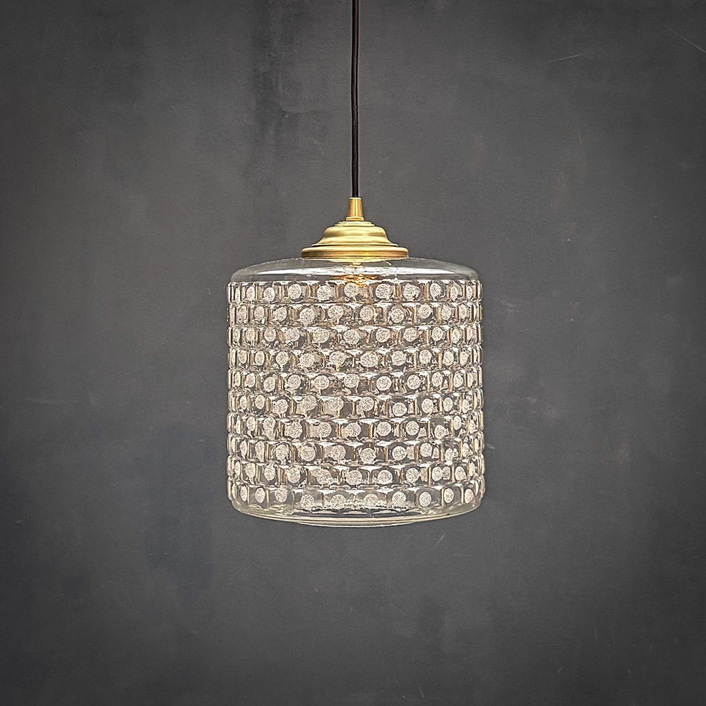 Suspension constituée d’un cylindre en verre à motifs alvéolés sablées.