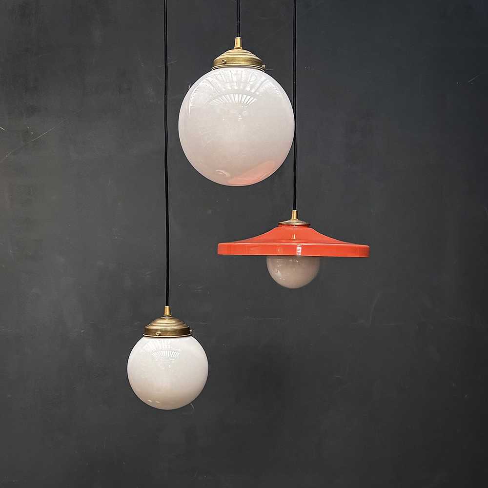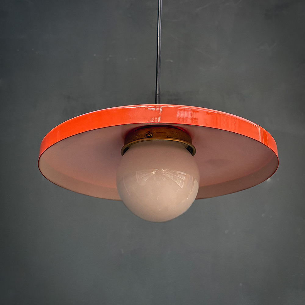 Suspension constituée d’une assiette plexiglas orange et d'une petite boule en opaline blanche.