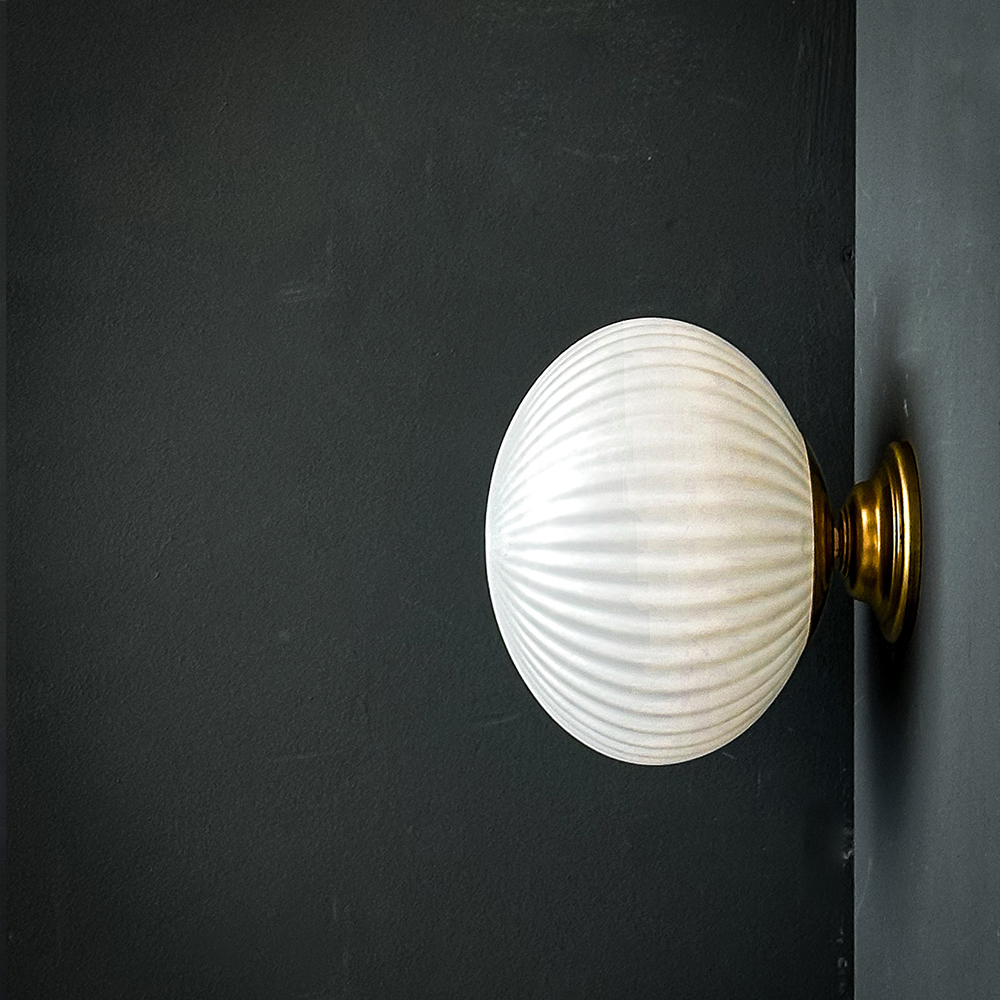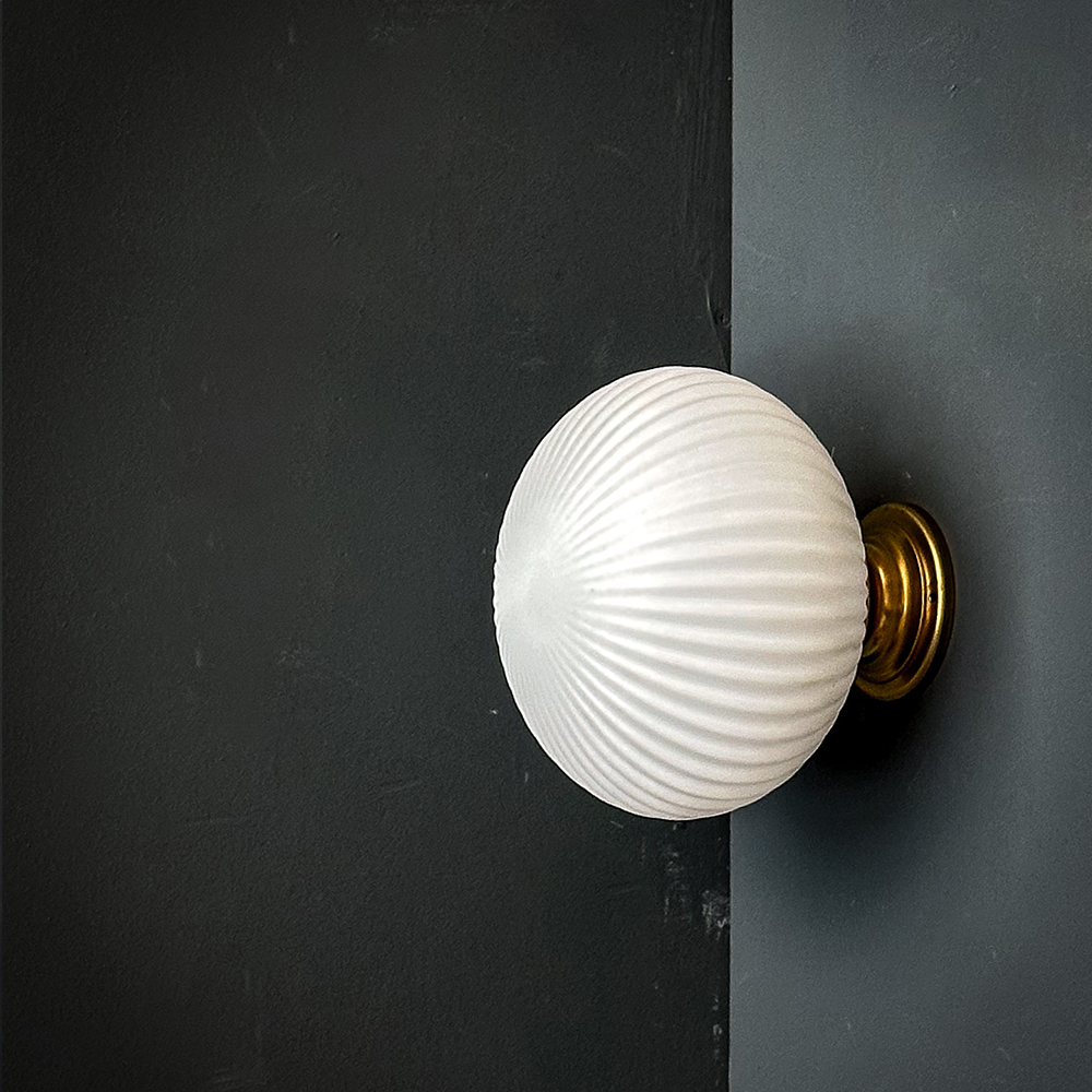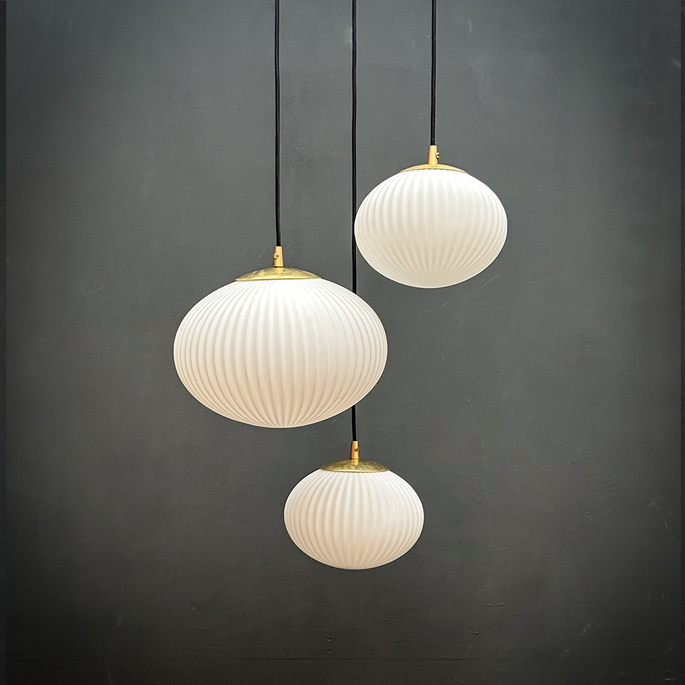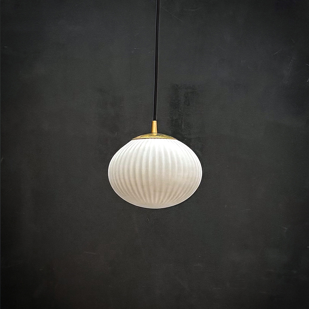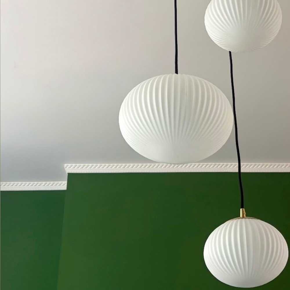 Suspension constituée d’un globe ovale en verre blanc mat strié.