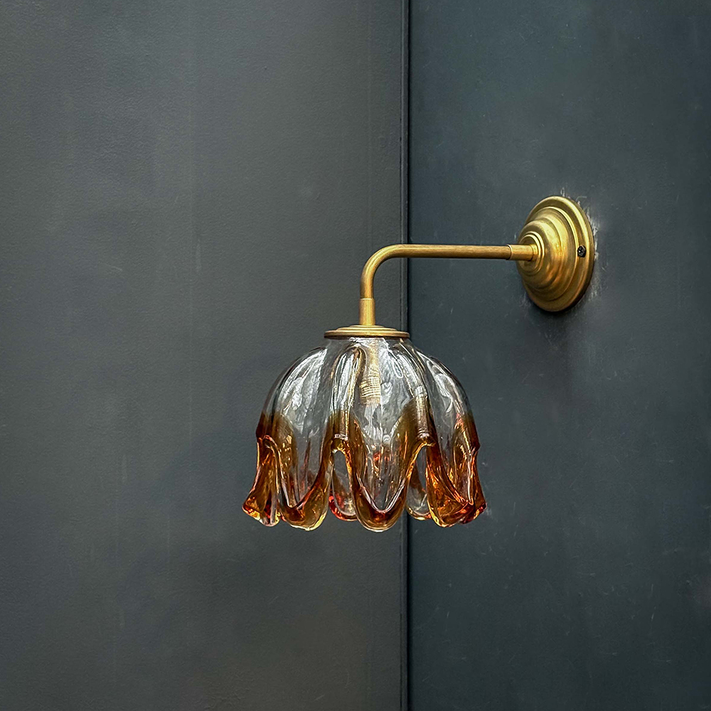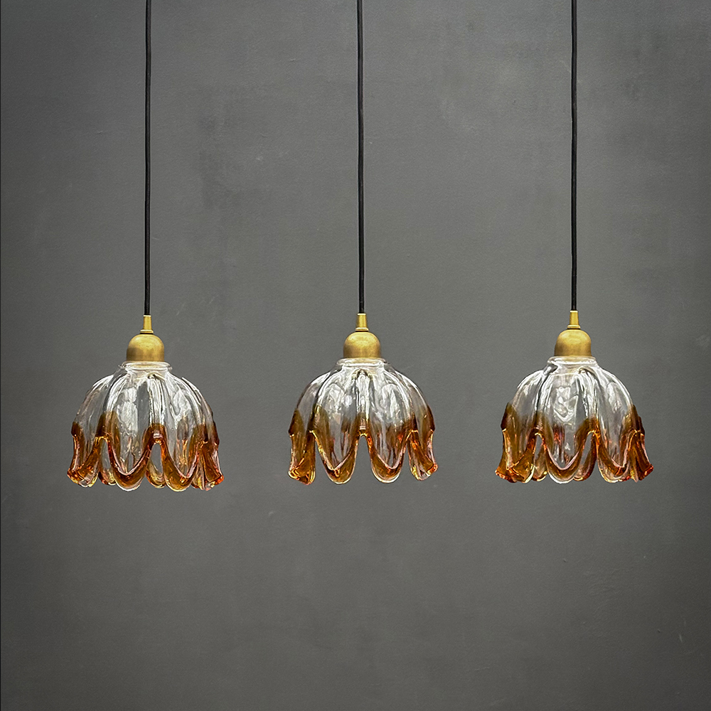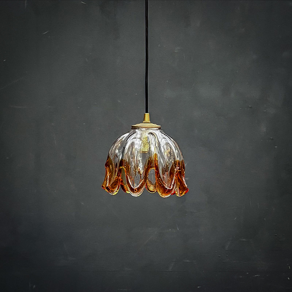 Suspension constituée d’une tulipe en forme de fleur en verre translucide et aux bordures ambrées.